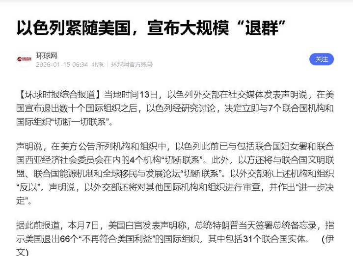 在国际秩序层面美国接连退出国际组织,以色列又同步跟进,这种 “退群潮” 也在冲击国际组织的权威性,让中小国家对国际秩序的信任产生危机。